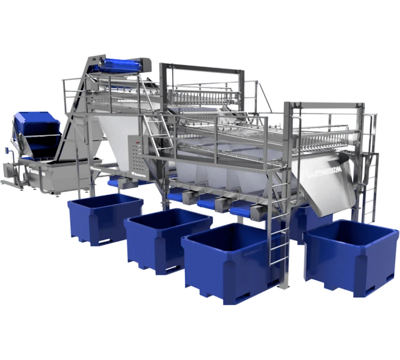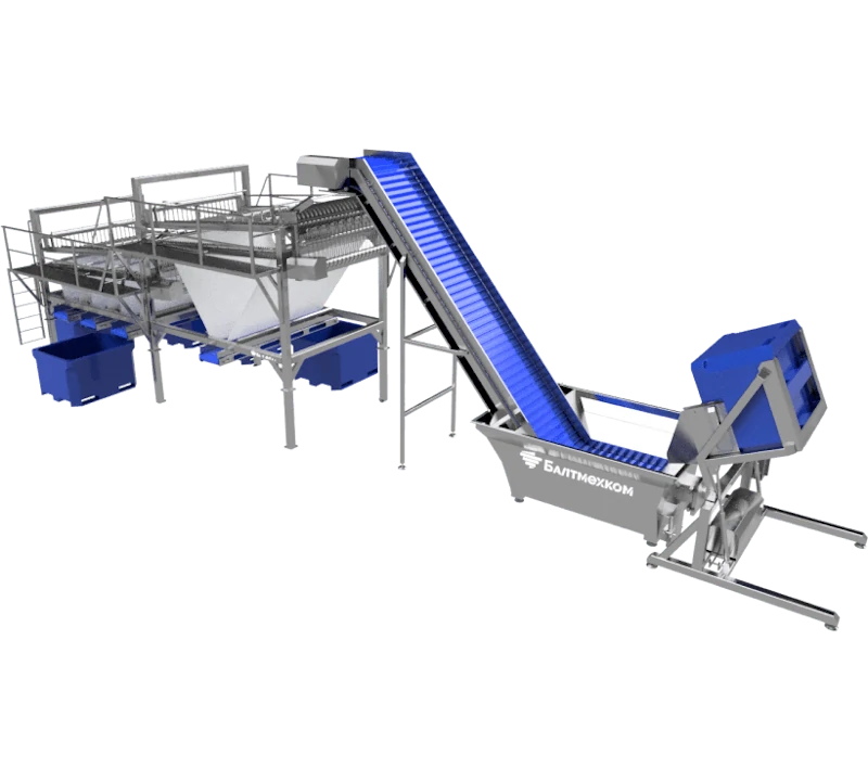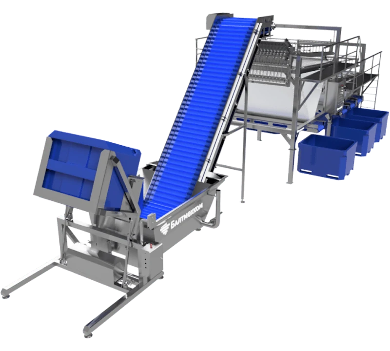 Мы проектируем линию под конкретные задачи: производительность (от 500 до 3000 кг/час и выше), количество фракций сортировки, тип контейнеров (евроконтейнеры, пластиковые ящики, корзины), возможность интеграции с моечными, филетировочными или заморозочными линиями.