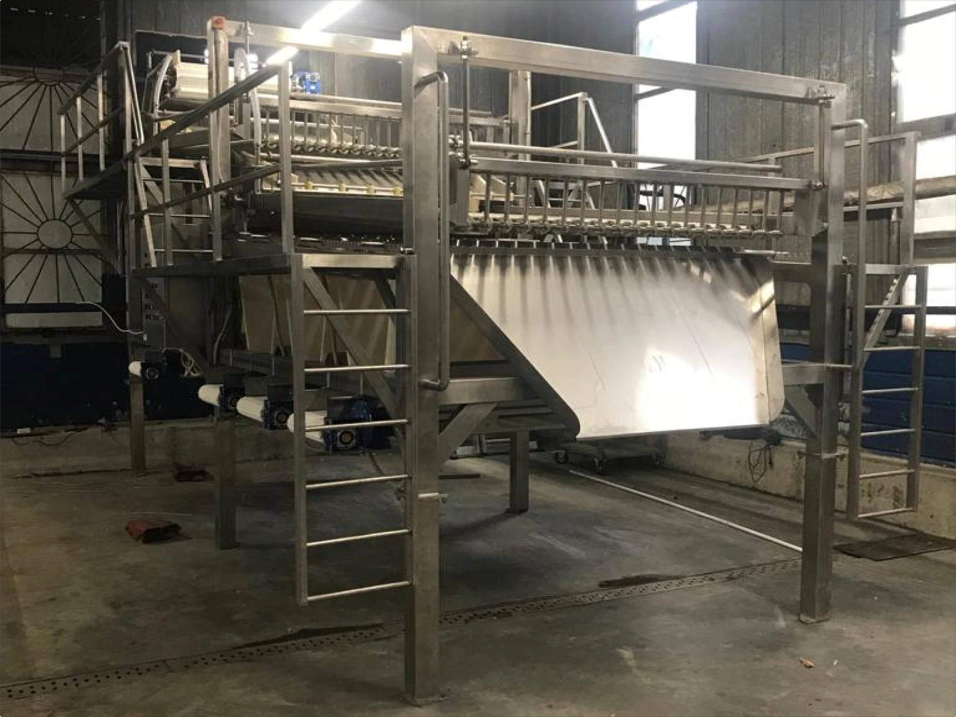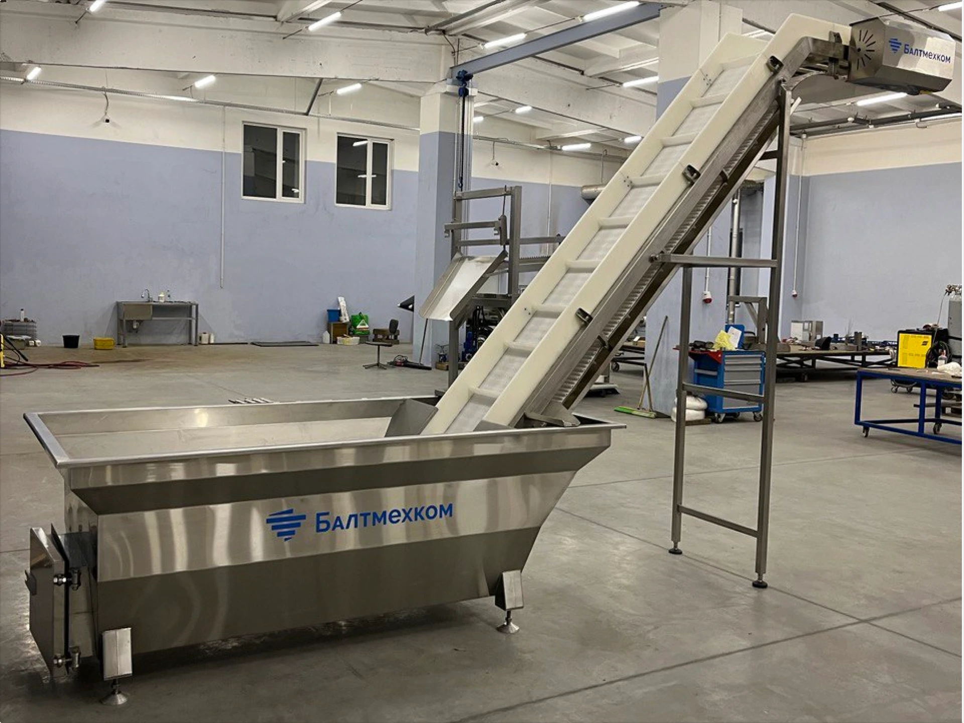 В мойке‑элеваторе рыба непрерывно перемешивается за счёт движения скребкового конвейера, вода постоянно обновляется через перелив. Удаляются остатки слизи, чешуя, мелкие примеси. Рыба поднимается элеватором и подаётся на сортировку равномерным потоком.