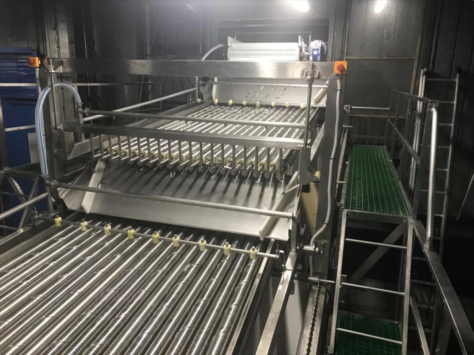 Рыба поступает на сортировочные валы. Благодаря конструкции она стремится расположиться вдоль оси валов, что обеспечивает точную калибровку. Мелкая рыба проваливается в щели (зазор регулируется) и попадает на отводящий конвейер первой фракции. Более крупная продвигается дальше и направляется на второй отводящий конвейер.