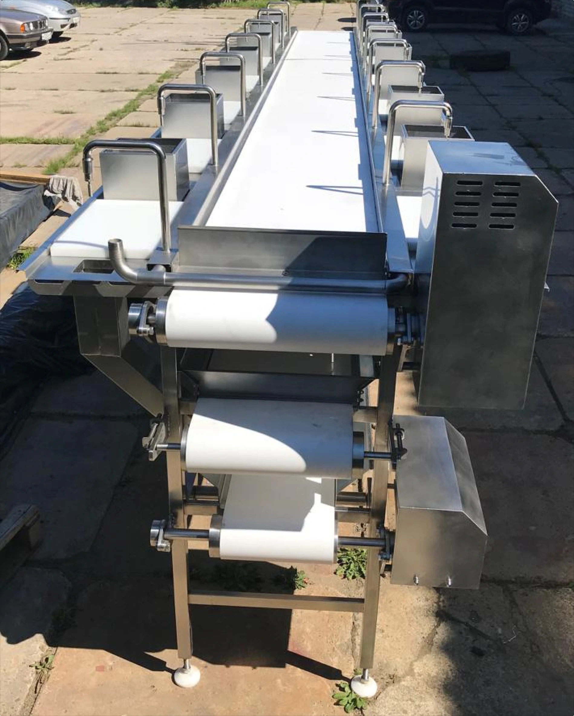 Рыба (предварительно размороженная или охлаждённая) поступает на подающий конвейер, который равномерно распределяет её по рабочим местам.