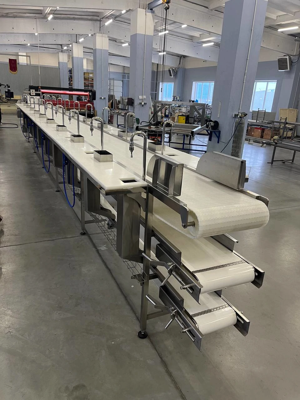Вода подведена к каждому столу — операторы могут сразу смывать загрязнения, поддерживая санитарное состояние без лишних перемещений.
