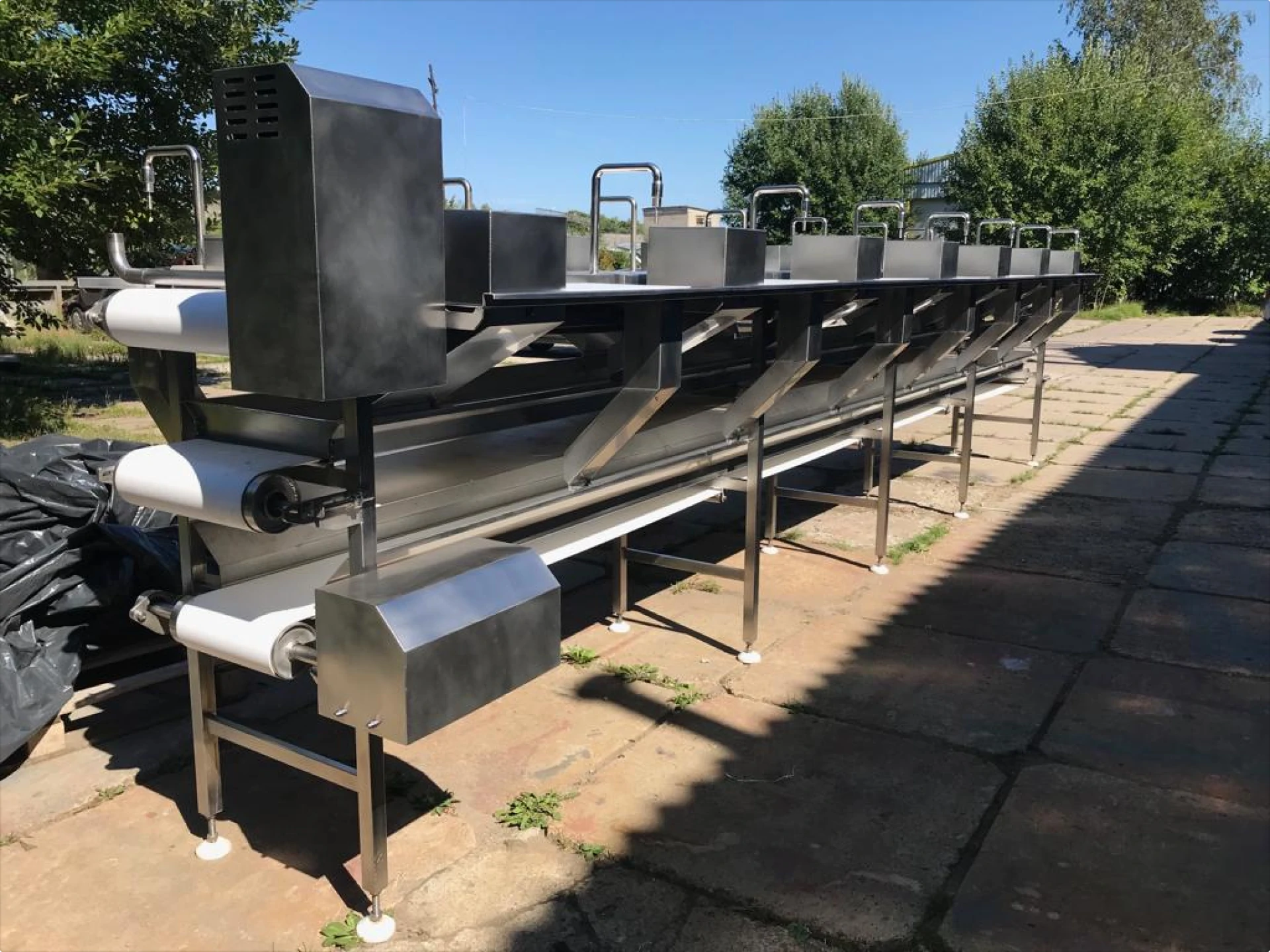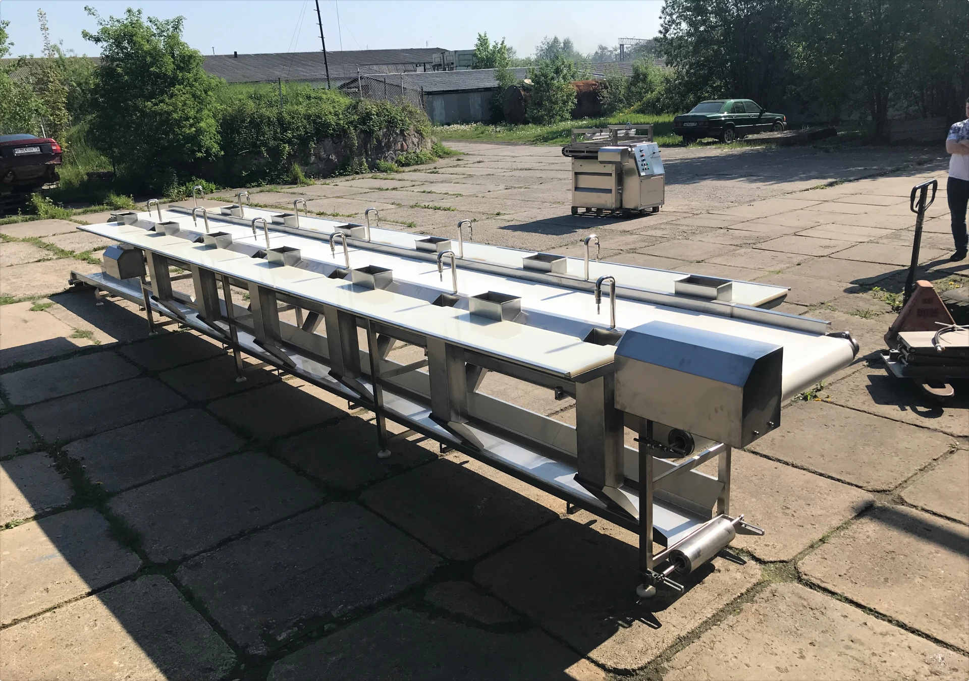 Линия может быть интегрирована с моечными, филетировочными машинами, набивочными аппаратами и морозильными камерами, образуя единый технологический поток.