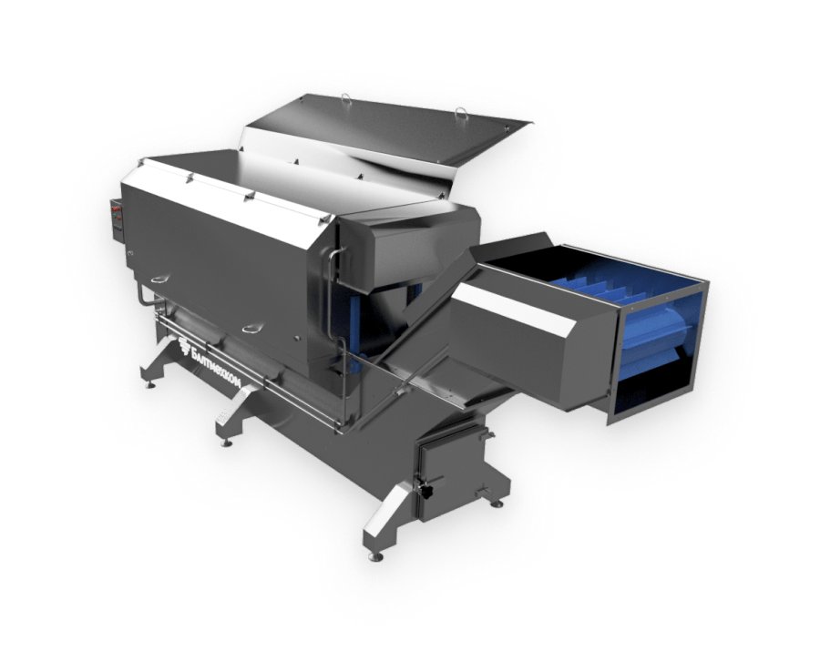 Продукт поступает через приемный лоток во вращающийся перфорированный барабан, погруженный на 1/3 в моющий раствор. По мере вращения барабана продукт перемешивается встроенными лопастями. Вращение барабана реверсивное, скорость вращения регулируется частотным преобразователем, на выходе барабана установлена шиберная заслонка, что позволяет выставлять различные режимы мойки. При открытии шиберной заслонки продукт поступает на отводящий Z-образный скребковый конвейер со встроенным душем и направляется на дальнейшую обработку.