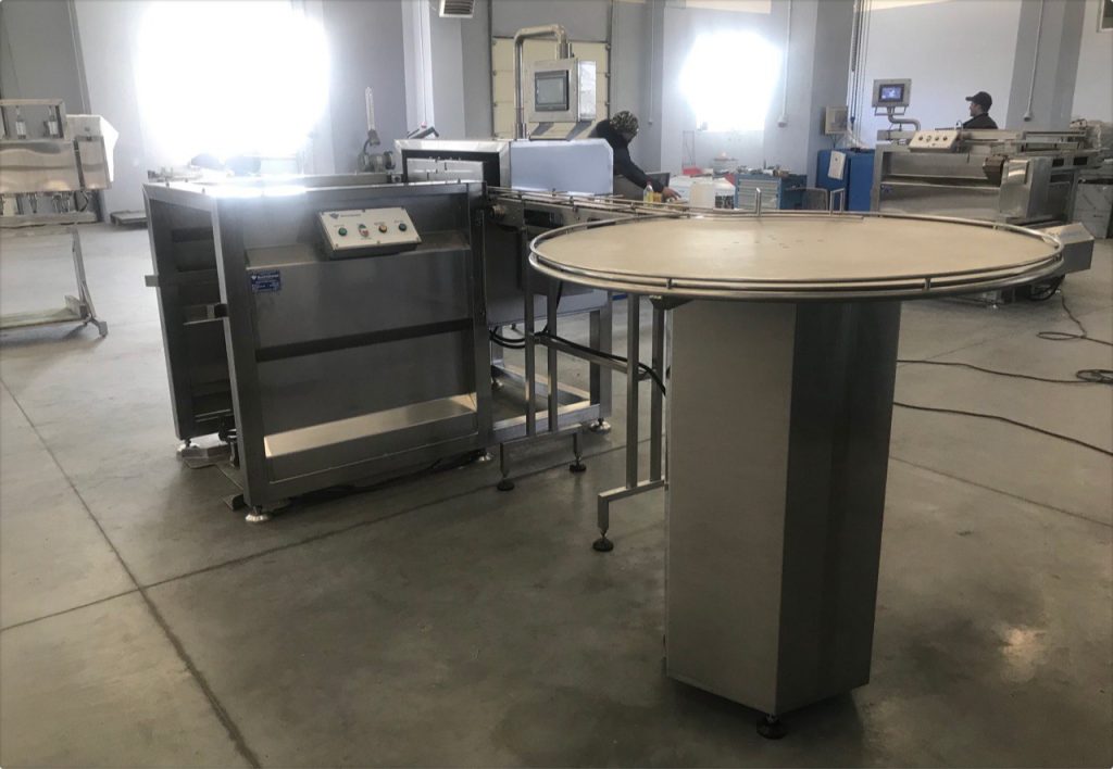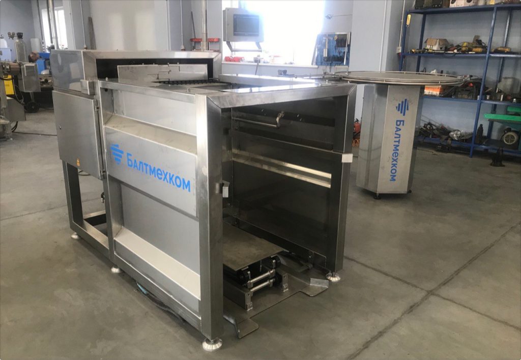 Загрузчик корзин автоклава. Консервная банка с роторного стола-ориентатора по конвейеру подается на приемный рольганг загрузчика корзин. Пустая корзина автоклава с подвижным дном, установленная на тележке, устанавливается в загрузчик и перемещается с рольганга тележки на рольганг загрузчика.