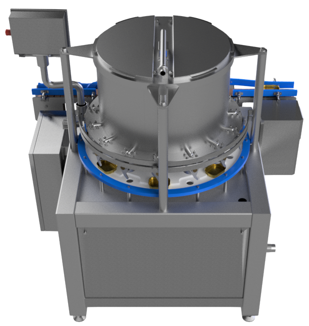 Это высокоскоростная система розлива, использующая вращающуюся карусель для непрерывного наполнения тары по мере её перемещения внутри машины. Разливочные головки расположены по кругу, контейнеры подаются в систему, наполняются во время вращения, а затем выгружаются в конце цикла.